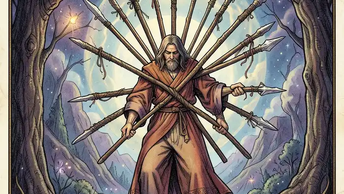 В древних рукописях Таро Десятка Жезлов часто описывается как карта, несущая тяжесть мира на плечах искателя. Эта карта появляется в раскладах, когда человек ощущает давление внешних обстоятельств, когда задачи множатся, а ресурсы кажутся ограниченными. По теории Юнга, Жезлы представляют энергию и волю, а десятка усиливает их до предела, превращая энергию в нагрузку.