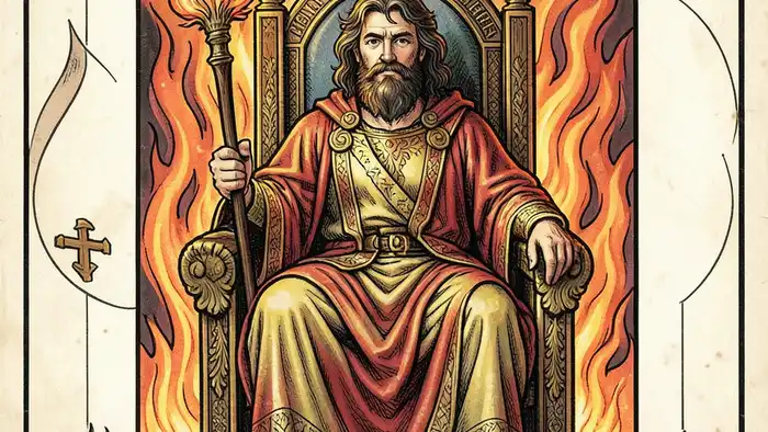 - Визуализируйте Короля Жезлов, сидящего на троне, держащего жезл.