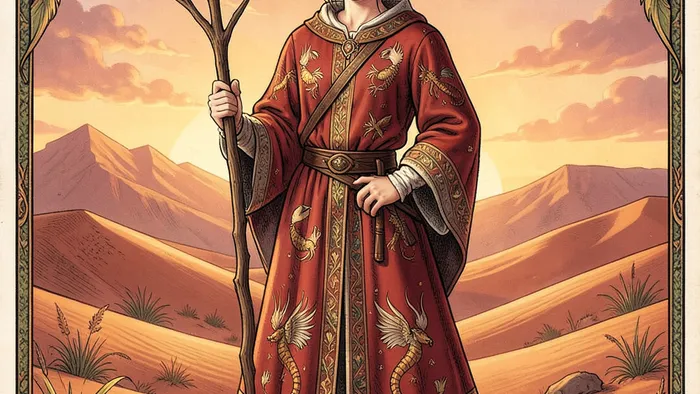 В классической колоде Райдера-Уэйта мы видим юношу, уверенно держащего жезл, который ещё не пустил листья. Он стоит на фоне жаркой пустыни, но смотрит не на сам жезл, а вдаль, как бы оценивая горизонт будущих свершений. Его одежда украшена саламандрами — мифическими существами, живущими в огне, что прямо указывает на связь со стихией. Жезл в его руках — это не оружие и не опора, а скорее антенна, проводник энергии и намерения.