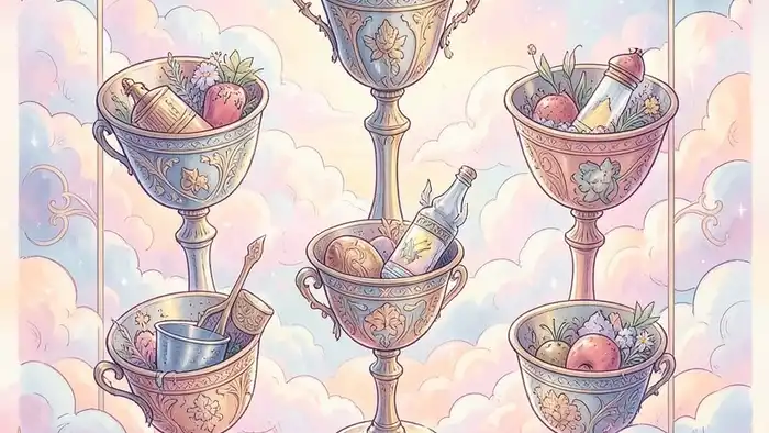 | Семерка Кубков | Выбор между иллюзией и реальностью | Множественные варианты, соблазны |