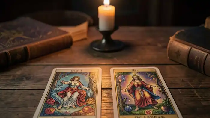 Эта карта раскрывает фундамент отношений: какие чувства, какие обстоятельства и какие уроки были получены. Часто здесь появляется «Влюблённые», указывая на глубокую связь, или «Тройка Мечей», символизирующая боль разрыва.