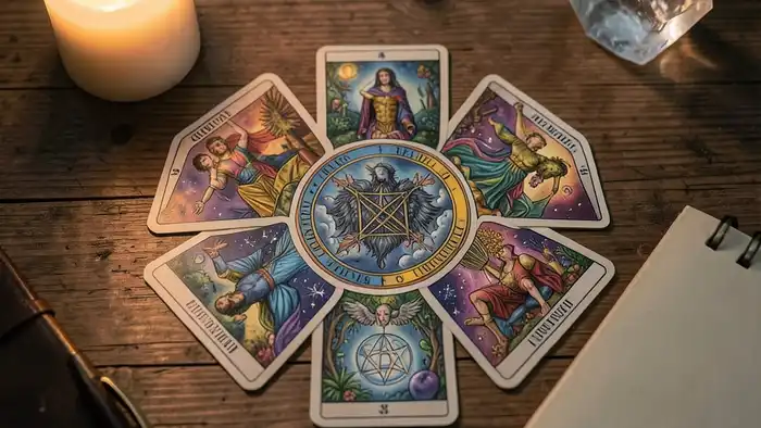 Расклад Таро «гексаграмма» на испытательный срок помогает понять, насколько проект выдержит проверку временем и какие скрытые силы влияют на его успех.
