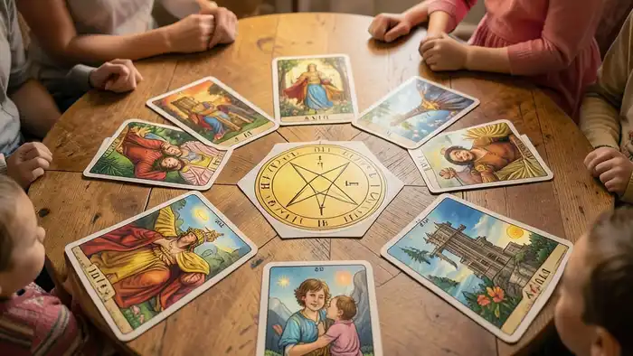 Попробуйте следующую медитацию: каждый член семьи по очереди берёт карту из колоды, задаёт вопрос «Что я могу сделать для гармонии?» и произносит короткое утверждение. Затем карта откладывается в центр, и все обсуждают её смысл.