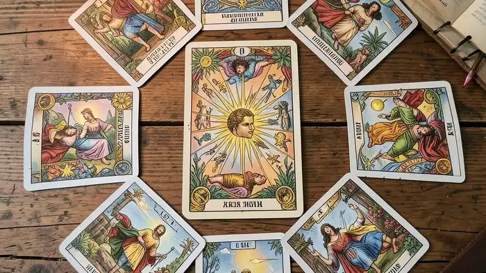 Комбинация «Колесо фортуны» + «Солнце» в позициях 4 и 7 говорит о том, что ваши возможности находятся в благоприятном фазе, и итоговый совет будет «действовать смело».