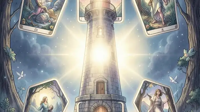 Согласно традиции Уэйта, карта Маяк часто ассоциируется с надеждой, ориентиром и спасением в темноте. В контексте разлуки она символизирует внутренний свет, который может вести к примирению или к новому пути. По Юнгу, архетип «маяка» – это образ «я», который ищет смысл в кризисе, позволяя интегрировать бессознательное содержание.