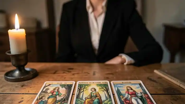 Клиент, 28‑летний специалист по маркетингу, задаёт вопрос: «Какой будет мой карьерный путь в ближайший год?» После перемешивания колоды он раскладывает карты.