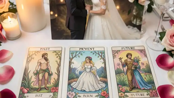 Расклад Таро «прошлое‑настоящее‑будущее» на свадьбу раскрывает скрытые динамики отношений, помогает понять, что уже пройдено, какие энергии сейчас влияют и что ждать в будущей совместной жизни.