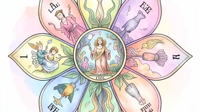 Схема расклада выглядит как цветок с семью лепестками, каждый из которых — отдельный аспект общения. Внутри цветка находится «ядро» — карта, отражающая ваше внутреннее состояние и готовность к новым связям.