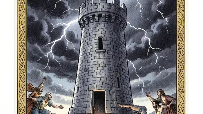 Башня действия таро — один из Старших Арканов, известный своей яркой визуализацией падающих башен и молний. В колоде Уэйта она изображена как высокая башня, охваченная огнём, из которой падают люди. По традиции Уэйта, карта символизирует «внезапный разрыв», но в более глубоком смысле — освобождение от ложных оснований.
