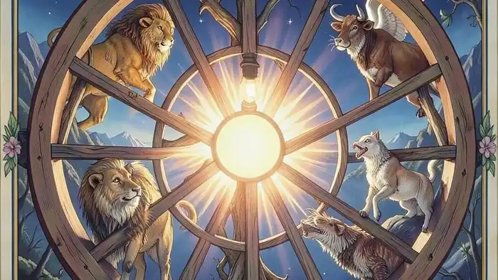 Колесо Фортуны — это архетипическая карта Старших Арканов, символизирующая непрерывный цикл перемен, в котором всё возникает, достигает пика, убывает и исчезает, чтобы возникнуть снова. На ней изображены четыре сущности — лев, ангел, орел и бык — символы евангелистов, стихий и архетипов сознания. Карта не предсказывает удачу или неудачу, а показывает момент перехода между состояниями. Ее суть — в признании, что ничего не остается неизменным, и истинная сила — в принятии этого потока, а не в попытке его контролировать.