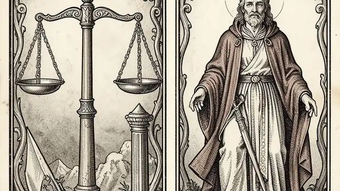 Старшие Арканы в Таро — это своего рода космический набор архетипов, каждый из которых несёт в себе глубокий смысл. Карта Справедливость (VIII в колоде Уэйта, XI в Тароте Марселя) представляет собой весы, меч и колонну, символизирующие равновесие, объективность и неизбежность судьбы. По теории Карнга, весы — это образ сознания, которое стремится к целостности, а меч — к резкому разрыву иллюзий.