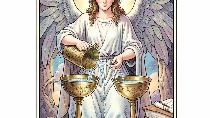 Карта Умеренность, известная в традиции Уэйта как "Temperance", представляет собой образ ангела, стоящего между двумя чашами, из которых переливается вода. По Юнгу эта карта олицетворяет архетип «Трансцендентного посредника», соединяющего противоположные силы. В контексте финансов Умеренность символизирует баланс между доходами и расходами, между желанием накопить и необходимостью инвестировать.