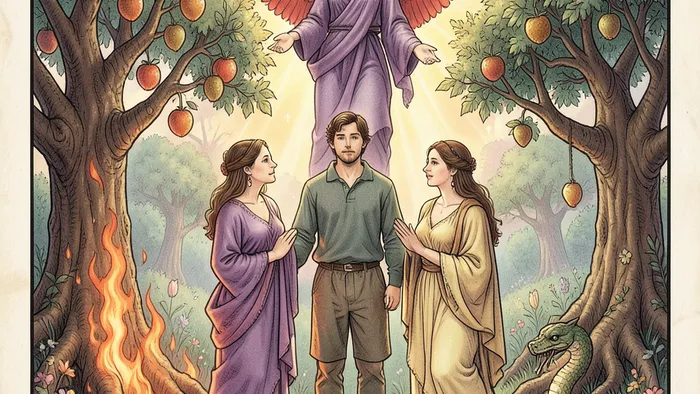 Взгляните на карту Уэйта. Ангел (Рафаил, покровитель путешественников) символизирует высшее сознание, божественное благословение и цельность. Его красные крылья — страсть, фиолетовое одеяние — духовную мудрость. Два дерева позади женщин: древо жизни (с огненными плодами) и древо познания добра и зла (со змеей). Это отсылка к Эдему. Мужчина стоит перед своим личным Эдемом, своим раем, который он может либо обрести через верный выбор, либо потерять.