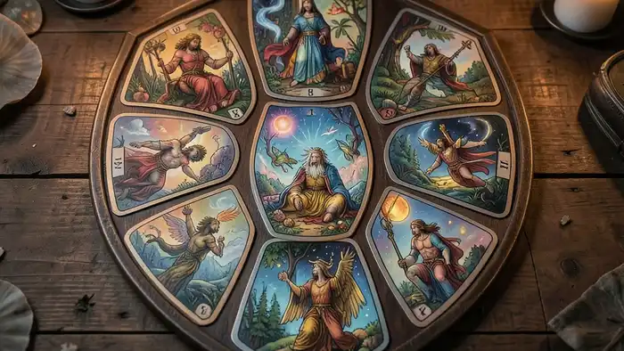 В современной практике расклад щит часто комбинируют с элементами психологии Юнга, используя архетипы для более глубокого анализа. Например, центр щита может представлять «Тень», а внешние карты — «Анима» и «Анимус».